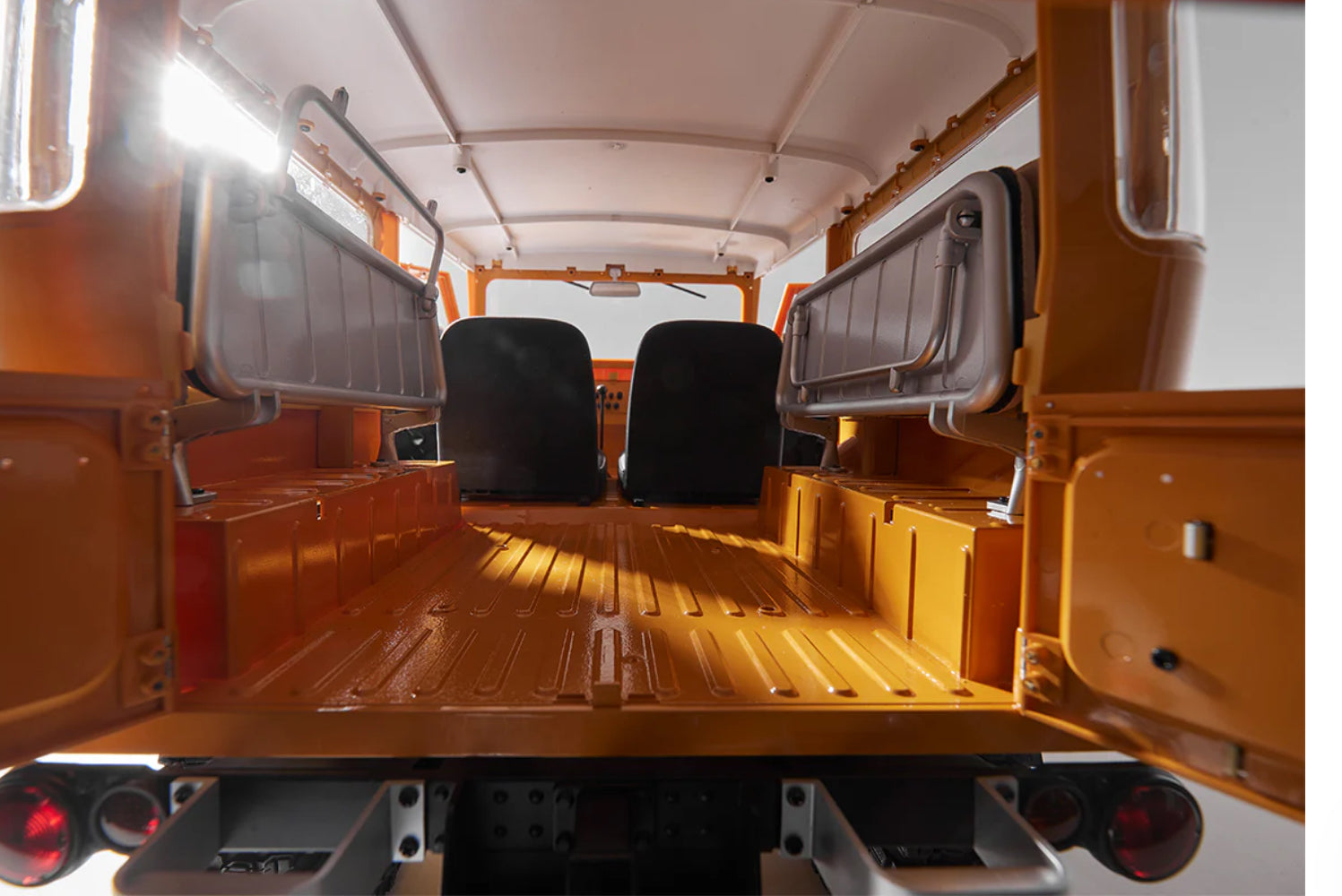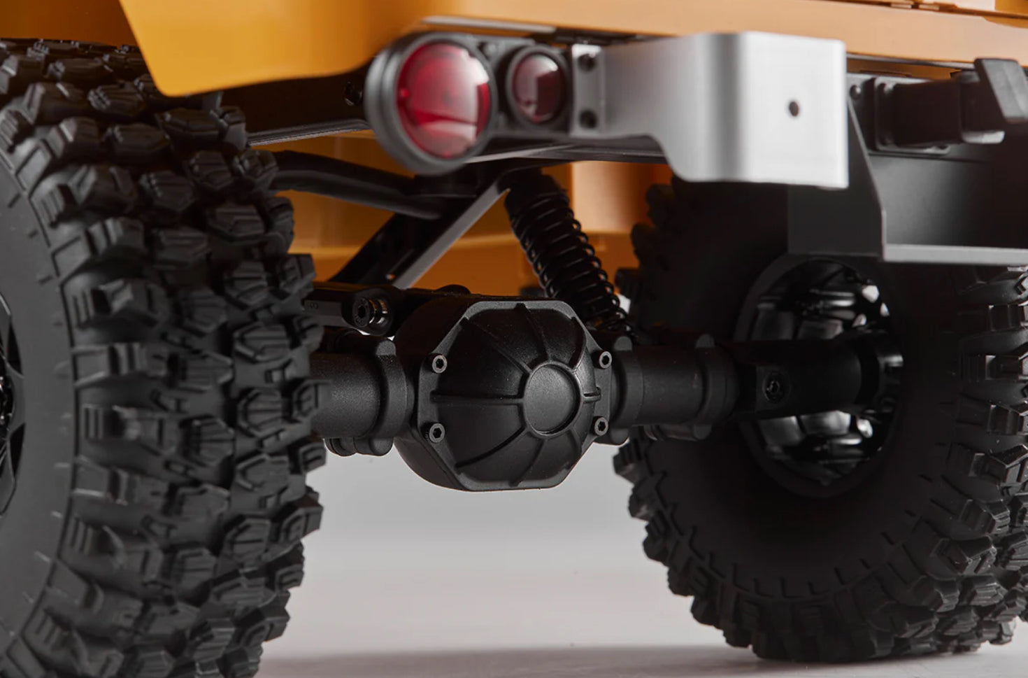 1.9" climbing tires allow for good grip on all terrains. The four-link suspension system ensures a larger shock absorber stroke and better passability. Metal trapezoidal beams provide a solid supportive structure. Even with the ABS hard body and full interior, the vehicle can easily overcome extreme road conditions. The real FJ40 uses leaf spring suspension. For those who pursue extreme simulation, the chassis can be installed with leaf spring suspension (sold separately) to restore the style of the real vehicle. Pursuing the needs of climbing performance and restoration seems to be impossible, but through the compatible design of the chassis and the replacement of a few accessories, it can take on a completely different shape. Two postures, and double the fun.