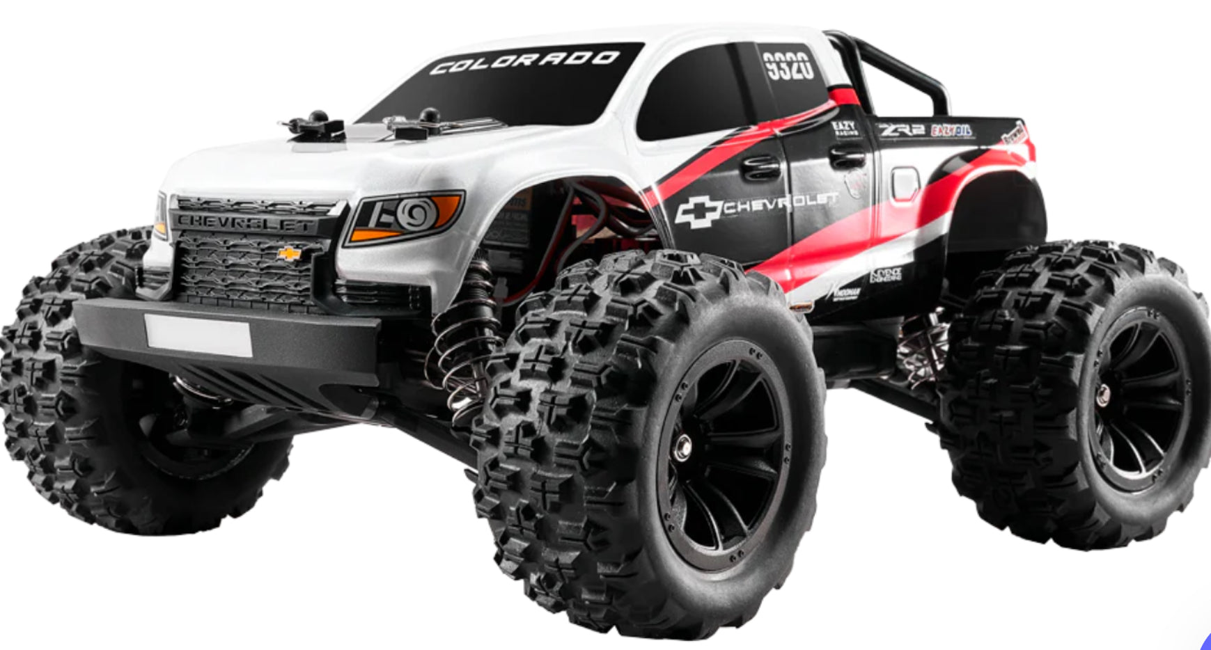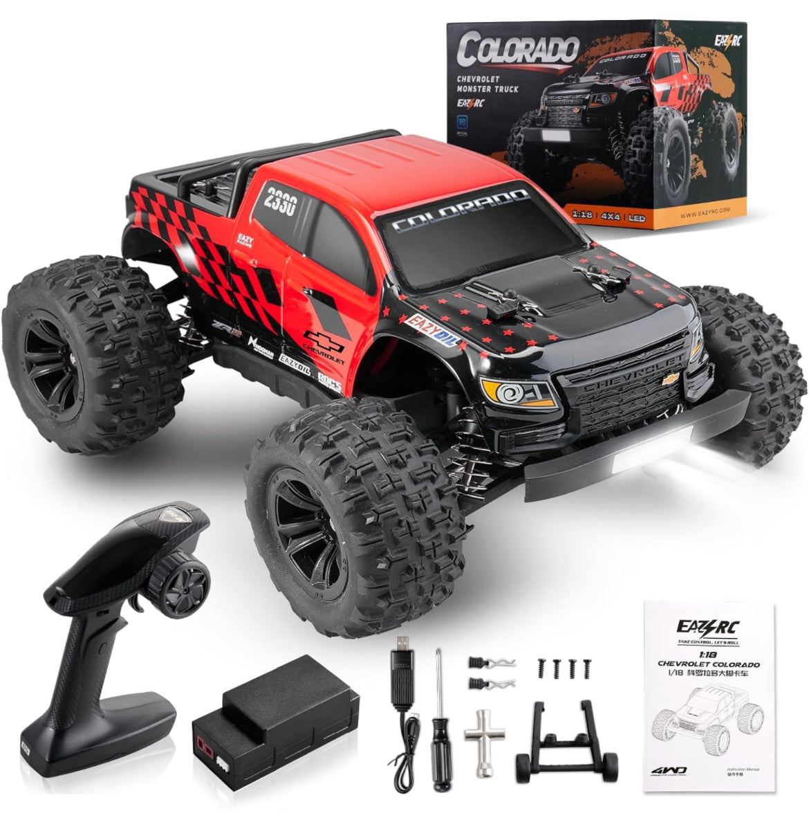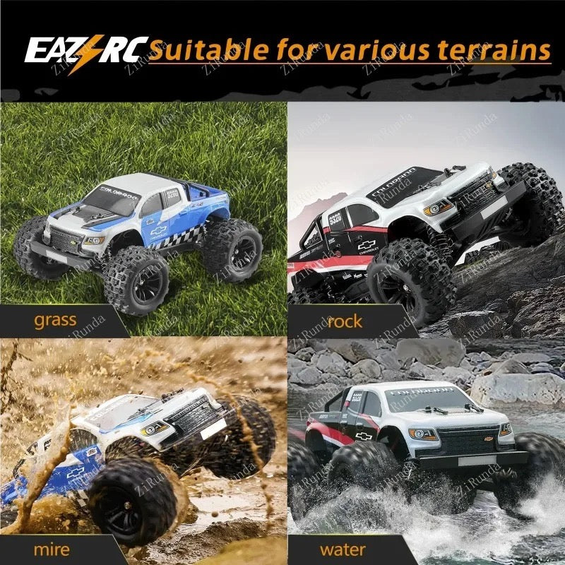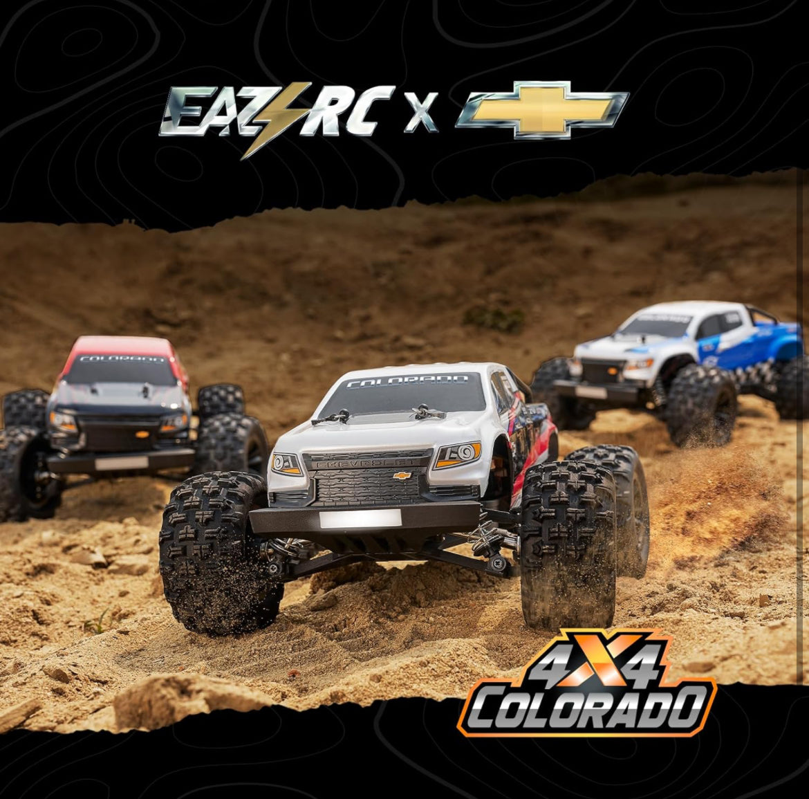 If you're looking for your first 1:18 RC monster truck, look no further than the EAZYRC 1:18 Chevrolet Colorado,licensed by General Motors LLC. 17g digital servo, 45A brushless ESC, 2S Li-Po battery, and a 4-pole high-torque brushless motor provide sufficient power for the full-time four-wheel drive system. The top speed reaches 45 km/h.