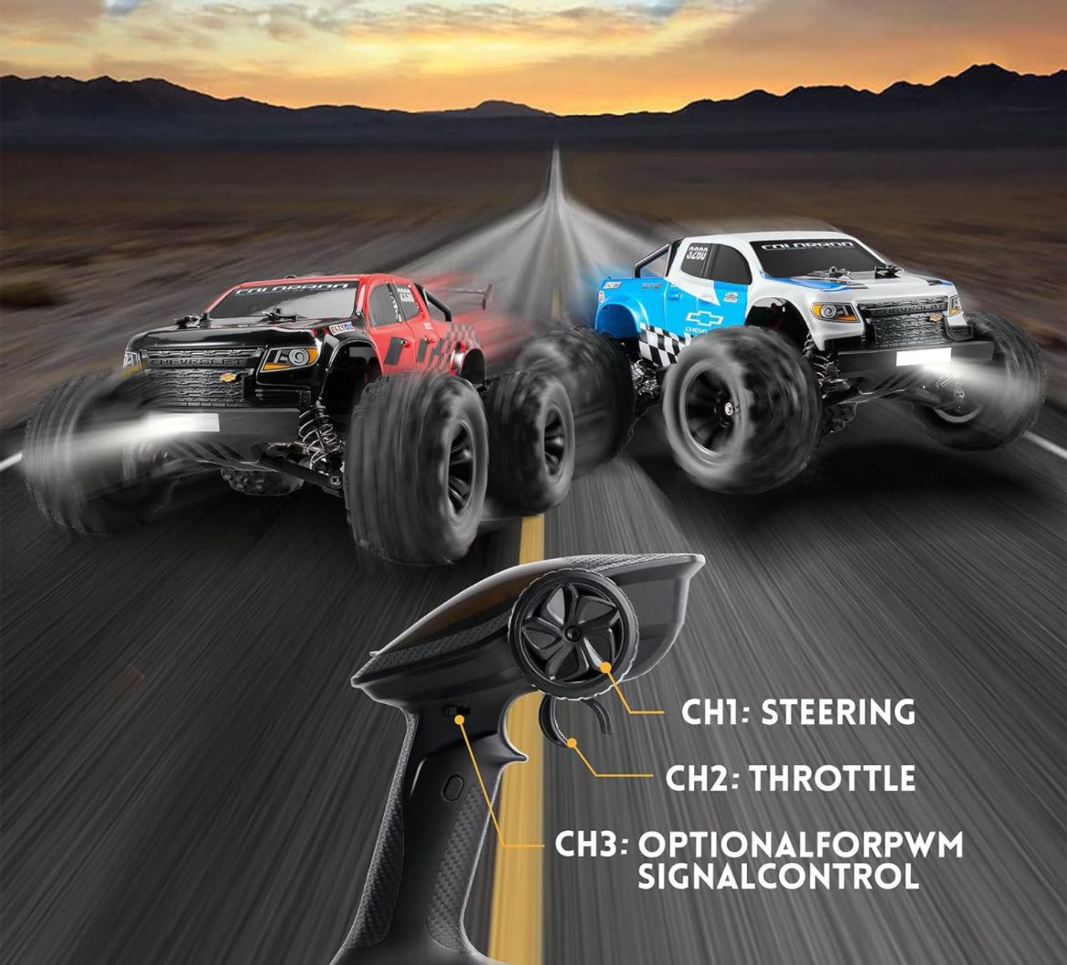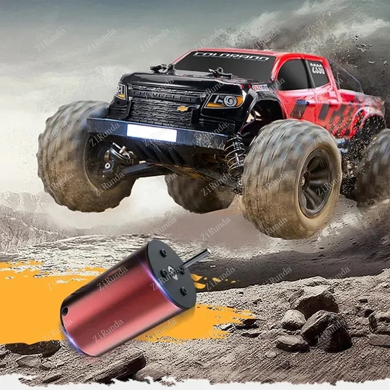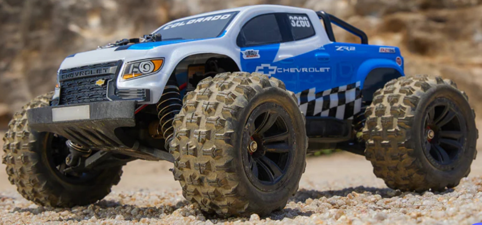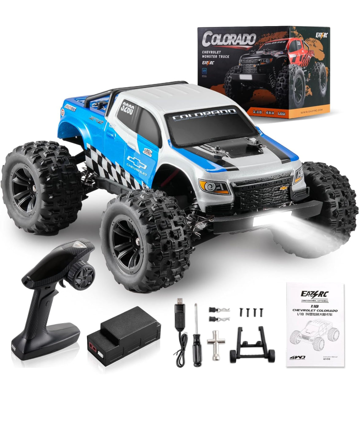 If you're looking for your first 1:18 RC monster truck, look no further than the EAZYRC 1:18 Chevrolet Colorado,licensed by General Motors LLC. 17g digital servo, 45A brushless ESC, 2S Li-Po battery, and a 4-pole high-torque brushless motor provide sufficient power for the full-time four-wheel drive system. The top speed reaches 45 km/h.