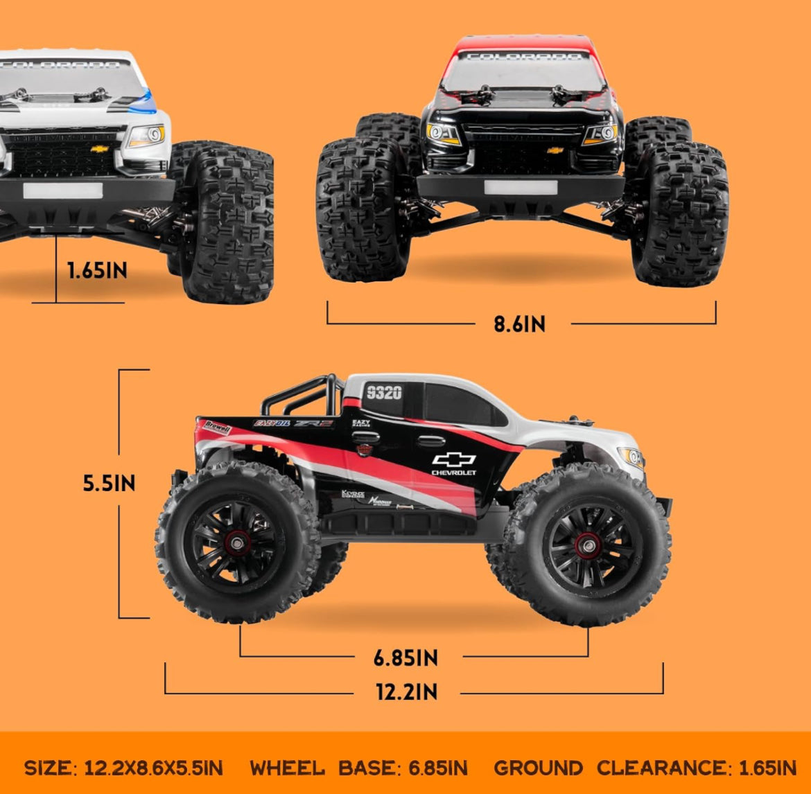 The chassis uses a honeycomb structure with metal reinforcements to increase the overall strength,and the durability is superior to that of similar products.The all-metal gears and metal differentials plus durable steel drive shafts, provide reliable heavy-duty transmission and can withstand extreme high-speed impacts.The whole vehicle adopts a modular chassis design so that the power system, electronic equipment, and differential components are easy to disassemble and the daily vehicle maintenance is simple.The all-metal oil-filled shock absorbers are proven to withstand the impact of high-speed jumps.The tires with asymmetric tread patterns provide EAZYRC 1:18 Chevrolet Colorado with excellent grip, making it easy to run smoothly on almost any road.