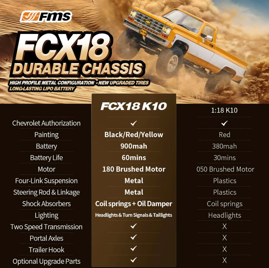 As the second model in the FMS FCX18 series, the FCX18 Chevrolet K10 is a standout contender in the realm of small-scale crawling vehicles and pays homage to the Chevrolet brand's cultural heritage, technological innovation, and off-road tenacity. With its rugged design and uncompromising performance, the FCX18 Chevrolet K10 is poised to carve its own path to greatness, setting new standards for excellence in the world of off-road exploration.