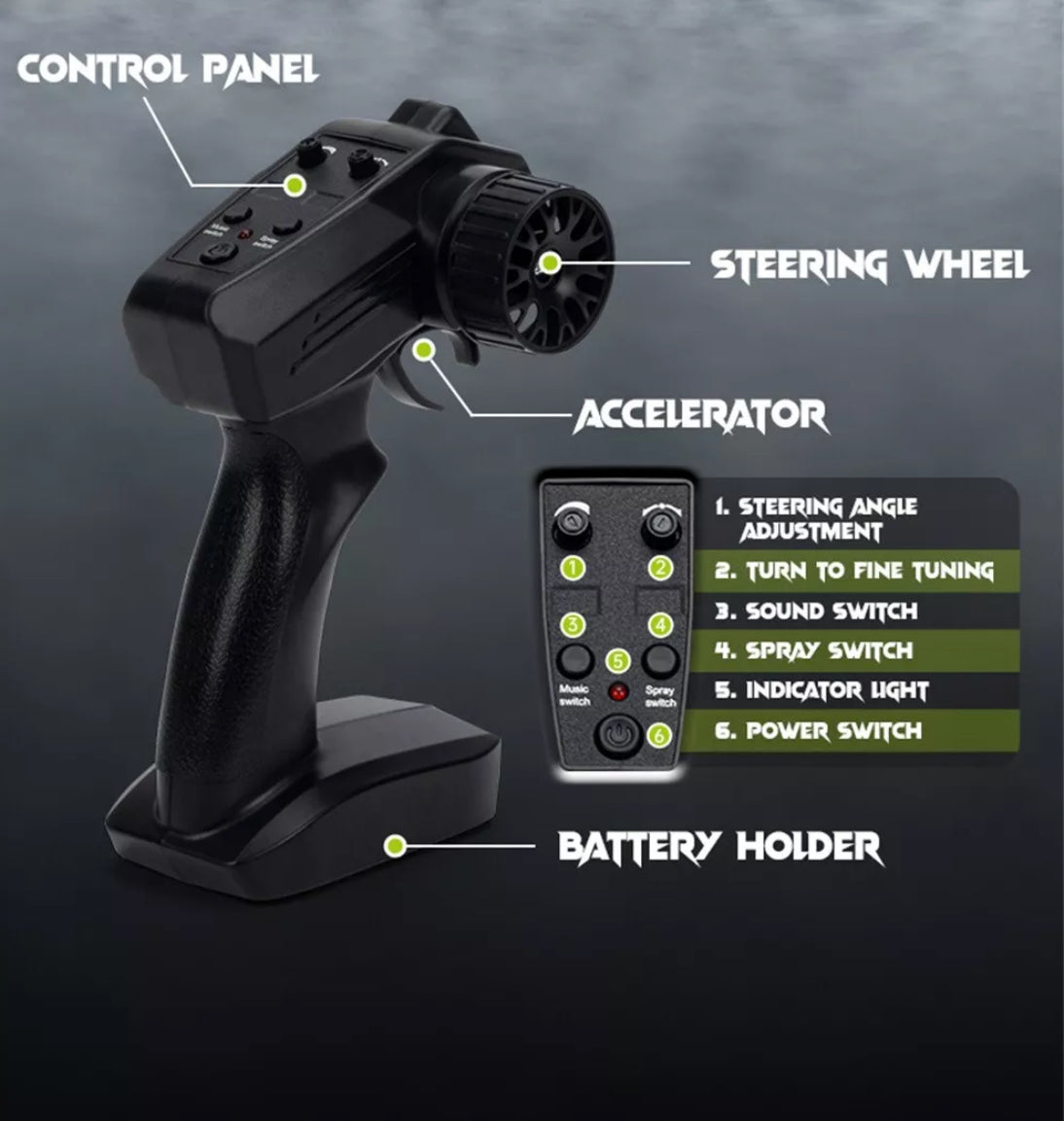 Function:Forward,backward,turn left/right,front rear LED light,spray,differential,full proportional servo