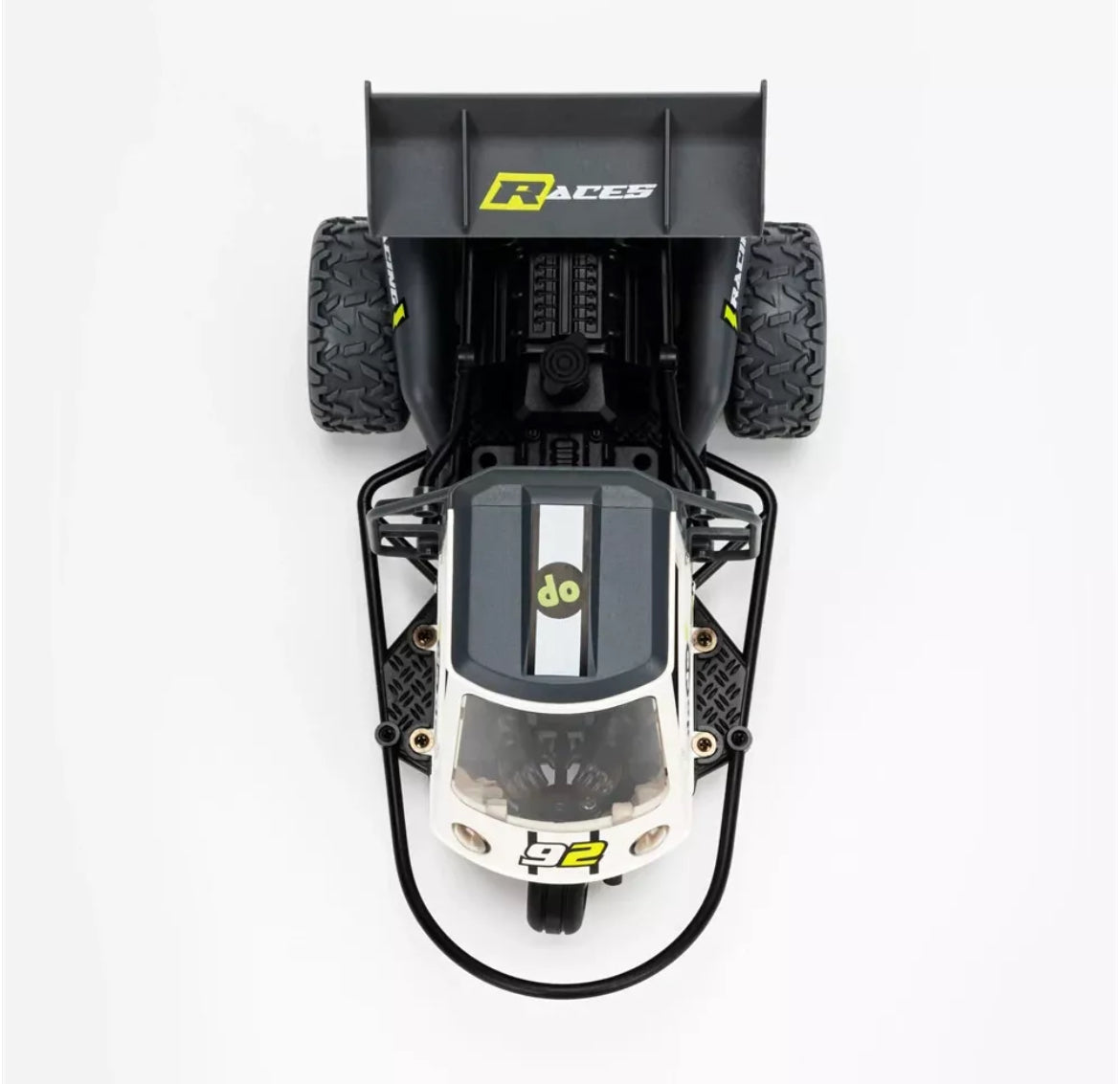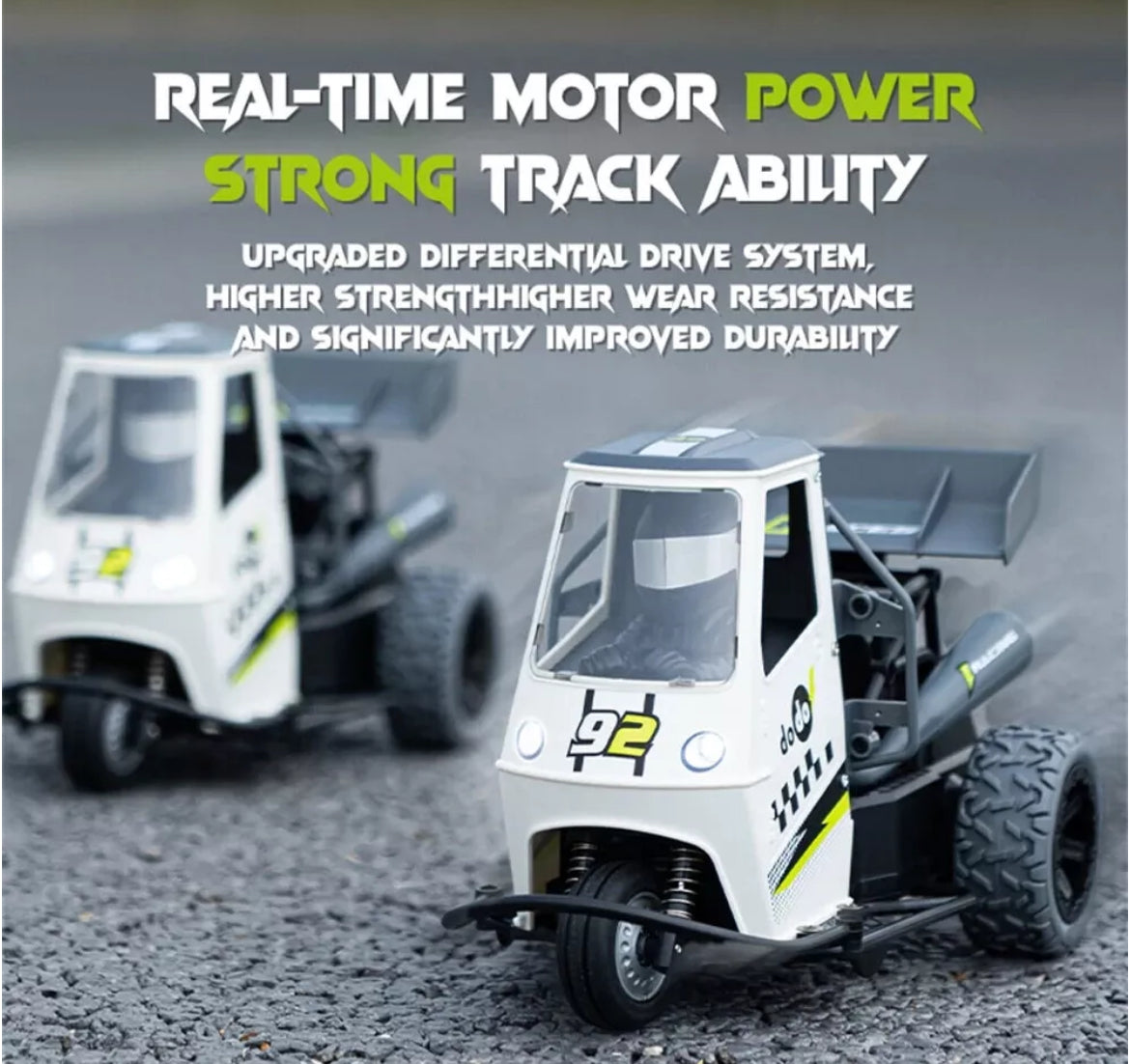 Anti -collision -to -side tilt structure, excellent handling, front rear high stroke suspensions, 9G steering servo (extremely fast reaction speed) in front, rear wheels with differentials, front and rear lights, light spray, horn,simulation engine sounds, the internal simulation doll, the doll's head can be shaked, the speed is 22+ km/h